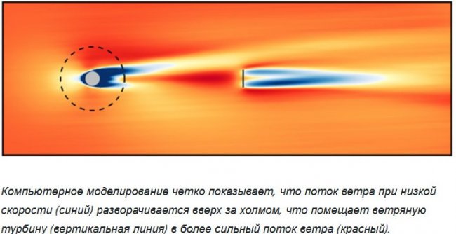 «Кроме того, направление ветра над холмом и у земли различается, — рассказывает Стивенс. — Это заставляет медленно движущийся поток отклоняться от точки нахождения ветрогенератора, благодаря чему ВЭУ, расположенная позади холма, попадает в сильные воздушные струи».