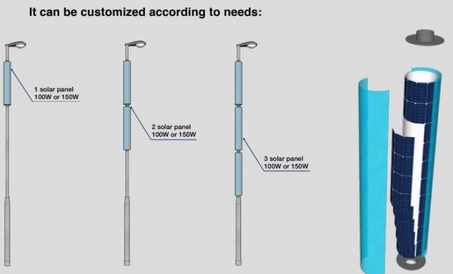 Итальянский стартап Fly Solartech Solutions разработал легкий цилиндрический модуль, подходящий для установки на фонарные столбы. Таким образом можно обеспечить за счет солнечного света электропитание ламп уличного освещения.