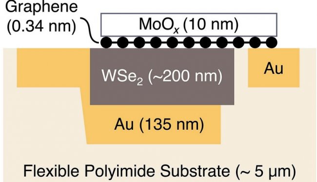 Однако наибольшее достижение ученых — толщина фотоэлемента, которая составляет всего несколько сотен нанометров. Прототип состоит из селенида вольфрама и золотых контактов, расположенных на слое графена толщиной в один атом. Все это находится между гибким полимером и антиотражающей оболочкой, которая повышает абсорбцию света. В полной сборке толщина фотоэлемента менее шести микрон — примерно как тонкий мешок для мусора. Если сложить вместе 15 таких слоев, получится толщина бумаги.
