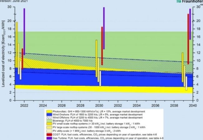 «Ветряные и солнечные станции в Германии обеспечивают значительно меньшую LCOE, чем обычные электростанции. Из-за роста цен на CO2-сертификаты (которые обязаны покупать предприятия, продуцирующие много парниковых газов) конкурентоспособность даже существующих угольных и газотурбинных электростанций в ближайшие годы будет падать», — отмечает доктор Кристоф Кост, возглавляющий проект.