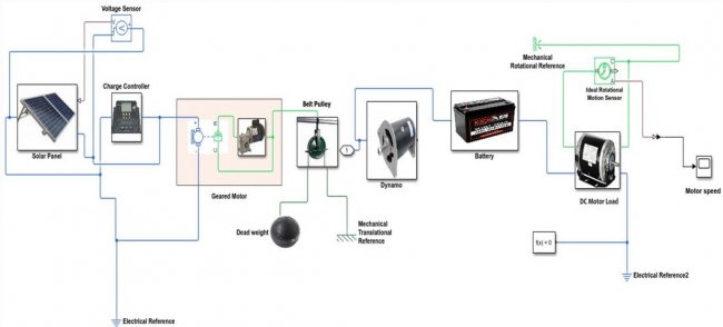 В состав экспериментальной установки вошли солнечные панели, инвертор, контроллер заряда, аккумуляторная батарея, мотор-редуктор, электрогенератор, компоненты механической передачи и груз.