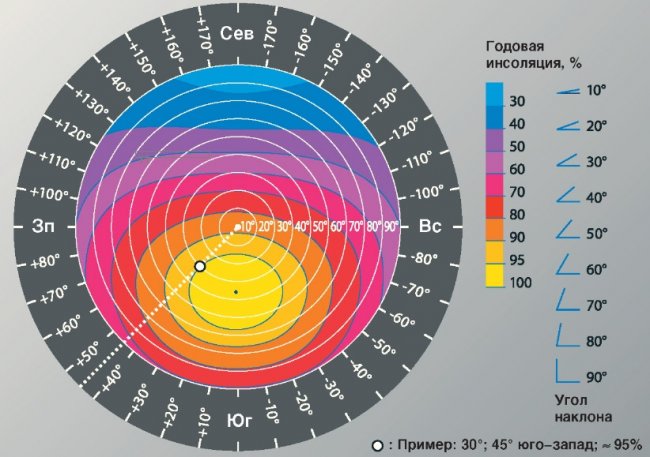 Зависимость количества солнечного излучения (годовая инсоляция) от угла наклона и направления установки солнечных панелей