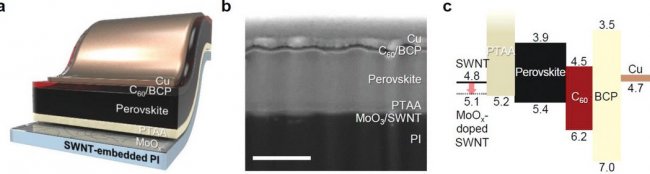 Чтобы создать действительно складную солнечную батарею, южнокорейские инженеры использовали проводящую пленку тонкую из однослойных углеродных нанотрубок. Ее объединили с полиимидной основой, а затем легировали оксидом молибдена, чтобы повысить проводимость.