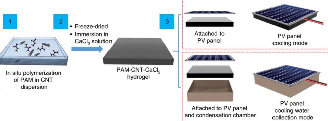 Новую технологию разработали исследователи из Политехнического университета Гонконга (PolyU). Для охлаждения солнечных панелей они решили использовать гель, который впитывает воду. Он представляет собой смесь углеродных нанотрубок с хлоридом кальция, солью, характеризующейся высокой гигроскопичностью и впитывает влагу из атмосферы по ночам, когда на улице прохладно, а выделяет ее обратно в дневное время.