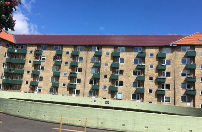 Красно-коричневые солнечные панели производства Sunerg совокупной мощностью 52 кВт недавно были установлены на крыше жилого комплекса в Копенгагене. Для этого пришлось полностью удалить деревянные стропила вместе со старой кровлей, после чего строители нанесли на перекрытие верхнего этажа двуслойное покрытие из асфальта. Затем на металлические крепления была установлена алюминиевая конструкция, которая послужила основой для солнечных батарей. Их красно-коричневая окраска дисгармонирует с цветом соседних черепичных крыш, однако в случае применения более светлых модулей мощность каждого снизилась бы до 240-250 Вт.