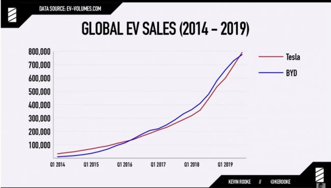 К октябрю 2019 года Tesla выпустила 807 954 электромобиля, тогда как BYD – 787 150 единиц, включая гибриды, при этом у Tesla все автомобили полностью электрические.