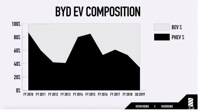 На втором графике видно, что в течение нескольких лет китайский автопроизводитель снижает продажи гибридных автомобилей на фоне роста электромобилей на батареях.