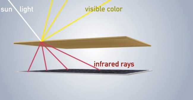 Специальная пленка наделена свойством отражать только видимую часть света, а для преобразования фотонов в электроэнергию используется инфракрасное излучение. Этот спектр не воспринимается глазом человека, а белый окрас панели практически не влияет на производительность системы.