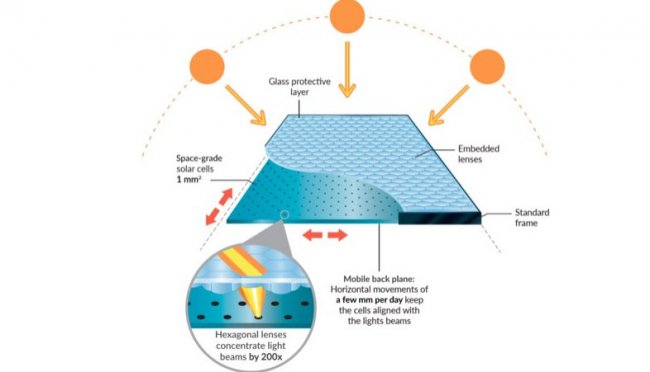 Благодаря оптической концентрации менее 0,5% всей поверхности необходимо покрыть ячейками для достижения оптимальной производительности. Это позволяет использовать технологии высокоэффективных космических солнечных элементов для массового рынка. Insolight объясняет, что защитное стекло панели содержит сетку из линз, которые концентрируют свет в несколько сотен раз.
