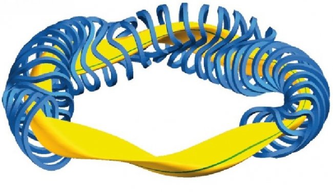 Схематическое изображение магнитного поля (синие линии) и плазмы (желтая область) в стеллараторе
