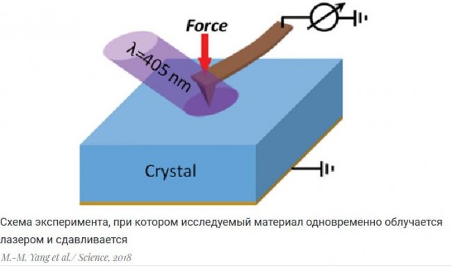 Ученые проверили предложенный метод на трех монокристаллах с выраженной центральной симметрией: оксиде титана(IV), титанате стронция и кремнии, освещая деформированный участок короткими лазерными импульсами. Оказалось, что для всех материалов предложенная схема приводит к возбуждению гигантского для этих кристаллов фототока — до нескольких десятков пикоампер при нагрузке 15 микроньютонов. При этом, например, плотность тока увеличивалась примерно на два порядка при повышении силы нажатия от 1 до 15 микроньютонов.