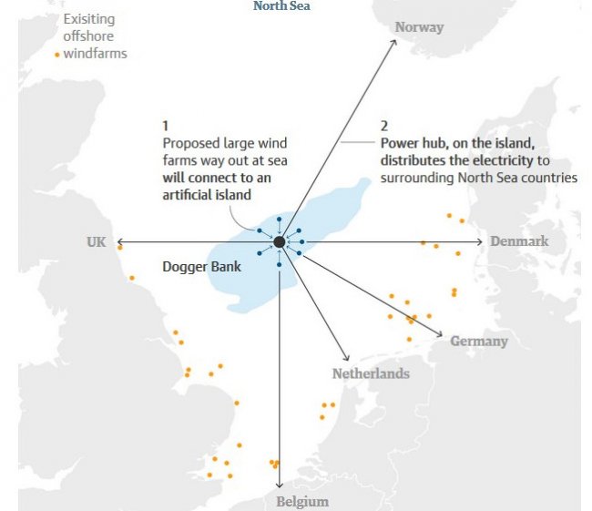 План, пребывающий на заключительных этапах проектирования, предполагает строительство искусственного острова площадью 5-6 квадратных километров на песчаной отмели Доггер-Банка, расположенной в 125 км от восточного побережья Англии.