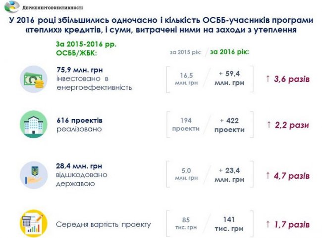 «В этом году одновременно в 2-3 раза увеличилось и количество ОСМД, которые обратились за Правительственной помощью на утепление жилья, и суммы средств, привлеченных ими на энергомодернизацию. Так, если в 2015 году реализовано 194 проекта по повышению энергоэффективности многоквартирных домов, то в 2016 году уже в 2,2 раза больше - 422 проекта. В 2015 году на эти цели ОСМД привлекли 16,5 млн грн. кредитных средств, а в 2016 году в 3,6 раза больше – 59,4 млн гривен. В общем, за два года в утепление многоэтажек инвестировано 75,9 млн грн средств ОСМД-участников программы», - сообщил председатель Госэнергоэффективности Сергей Савчук и добавил, что государство, со своей стороны, за 2015-2016 год возместила этим ОСМД 28,4 млн гривен.
