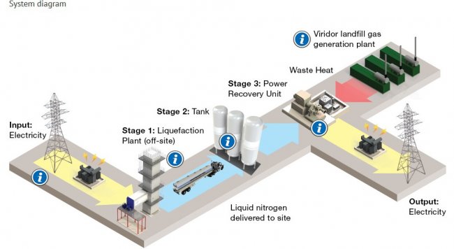 Криогенная электростанция накапливает энергию из возобновляемых источников энергии или энергию, выработанную другими объектами во время не пикового потребления, путем охлаждения воздуха и последующего хранения его в жидкой форме.
