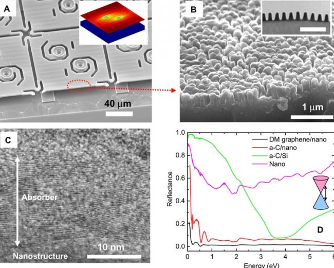 Для получения пленки ученые скомбинировали два подхода. Во-первых, в качестве основного материала они взяли графен, который поглощает свет в очень широком диапазоне волн, от видимого света до ультрафиолета. Во-вторых, исследователи воспользовались аморфными наноструктурами, внутри которых «теряется» значительное количество излучения определенной длины волны.
