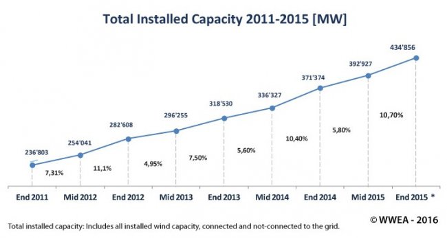 По данным Международной ассоциации ветроэнергетики, общий объем ветровых мощностей в мире к концу 2015 года составил 435 ГВт.