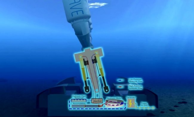 В результате конструкция на шарнире беспрерывно качается в такт набегающим волнам, а энергия этого движения конвертируется в электричество с помощью автономного гидравлического модуля O-Drive (запатентованная разработка BPS), который преобразовывает механическую энергию в жидкостное давление, приводящее в движение генератор. Полученная электроэнергия доставляется на берег посредством подводного кабеля.