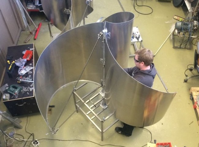 Новый ветряк с вертикальной осью вращения оснащен лопастями необычной формы из углеволокна и нержавеющей стали, которые позволяют выдерживать штормовые ветра. Вместе с тем, конструкция турбины получилась достаточно простой. Сам автор проекта говорит: «Турбина работает просто. И вообще, чем проще система, тем она надежнее».