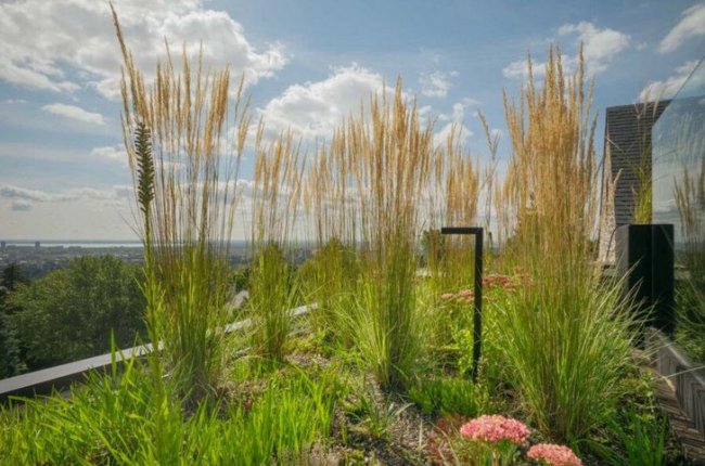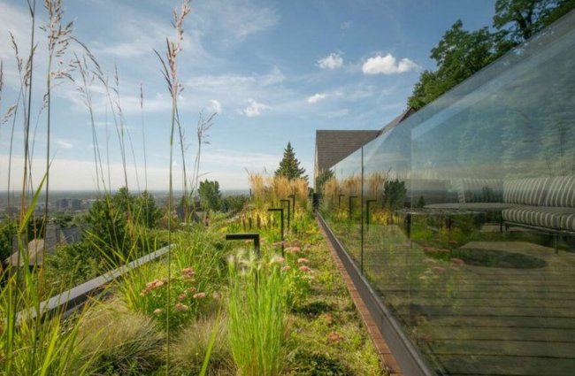 Стеклянное ограждение по периметру обеспечивает безопасность нахождения на крыше и в то же время не мешает обозревать окрестности. С зеленой террасы, украшенной розовыми, пурпурными и голубыми полевыми цветами, открывается превосходный вид на центр города Монреаля. Здесь также нашлось место для таких растений как мискантус, вейник, ячмень гривастый, молодило и можжевельник распростертый.
