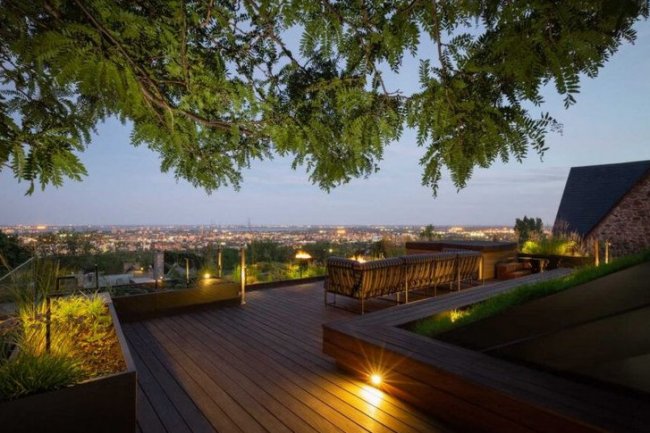 Эта зеленая крыша площадью 182,5 квадратных метров была обустроена летом 2018 года. Посетители здесь могут отдыхать на объединенных с вазонами деревянных скамейках, изготовленных на заказ, или на мягком диване. Уютное освещение в темное время суток создают светильники от Jardin d’ombre et lumière.