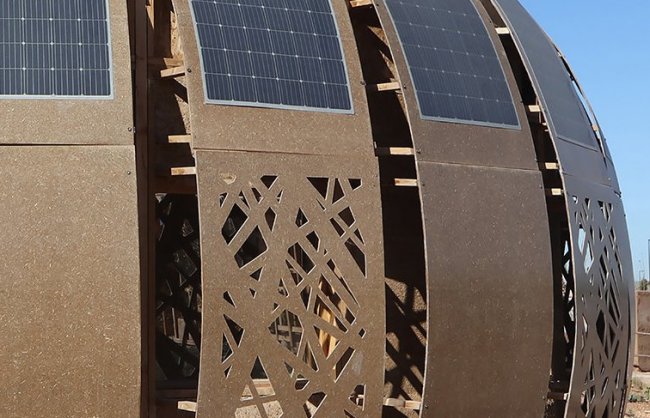 Конопляный дом имеет сферический наружный каркас, покрытый массивом из 24 гибких солнечных панелей производства компании DAS-Energy. Они расположены по периметру и направлены во все стороны, чтобы использовать максимум солнечного света. Фотомодули закреплены на изогнутых биокомпозитных плитах, также изготовленных из конопли, служащих для защиты задней стороны панелей от экстремальных погодных условий полупустыни, где температуры значительно высоки.