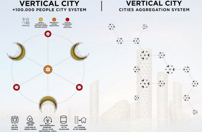 Итальянская архитектурная фирма Luca Curci Architects представила на Knowledge Summit 2019 в Дубае футуристичный концепт «Вертикального города» (Vertical City). Предполагается, что он будет состоять из модульных небоскребов с нулевым потреблением энергии и фундаментом, заложенным на дне океана.