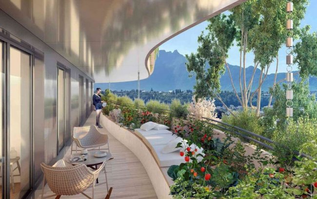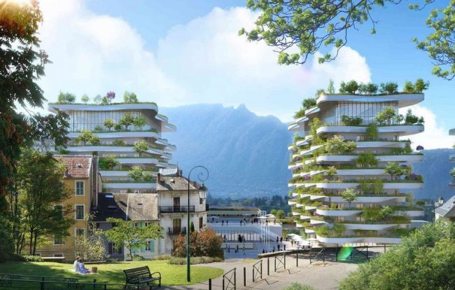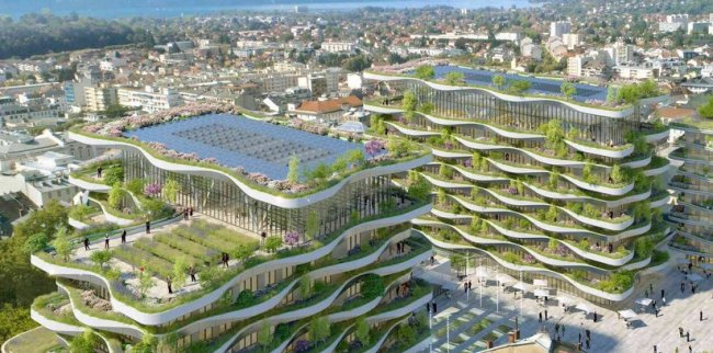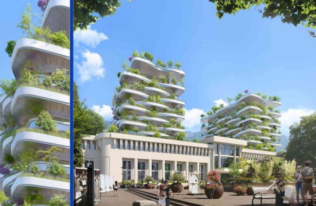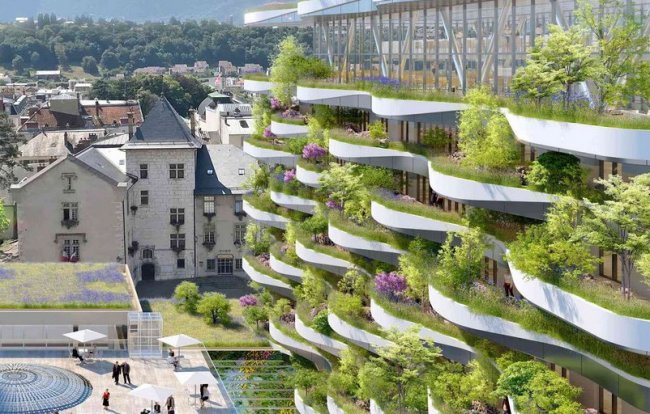 Конкурс на модернизацию исторического термального бассейна в Экс-Ле-Бене выиграло архитектурное бюро Vincent Callebaut Architectures. Его руководитель, Венсан Каллебо, имеет репутацию экологического архитектора, поэтому проект включает в себя множество зеленых технологий, в том числе солнечные панели, наружное озеленение, сбор дождевой воды и прочее.