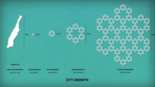 Платформы конструируются на земле и спускаются на воду кластерами, которые превратятся в поселок численностью до 1650 человек. Затем шесть таких кластеров могут формировать вокруг центральной гавани более крупное поселение, которое размещается в акватории заливов.