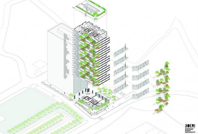 «Зеленый» дом Стефано Боери будет иметь 21 этаж плюс два подземных уровня. Первый этаж отдадут коммерсантам, а выше будут располагаться 105 апартаментов.