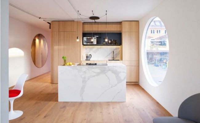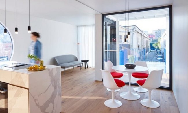 Современный и динамичный вид дому придают круглые окна, а интерьер подобран в современном минималистском стиле. Естественный свет и легкость окружающего пространства заставляют немедленно забыть, что когда-то это было обычным боксом для перевозки грузов.