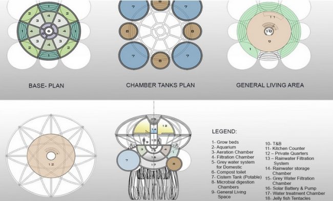 Купол каждого «дома-медузы» представляет собой массив из солнечных батарей, под ним размещается зеленый сад, полив которого осуществляется очищенной с помощью фильтрации водой. Длинные щупальца медузы собирают плавающий в водоеме мусор без ущерба для живой природы. Они также проверяют воду на токсичность и запускают процесс очистки воды с помощью уникальных камер микробиологического пищеварения, затем очищенная вода возвращается в окружающую среду.