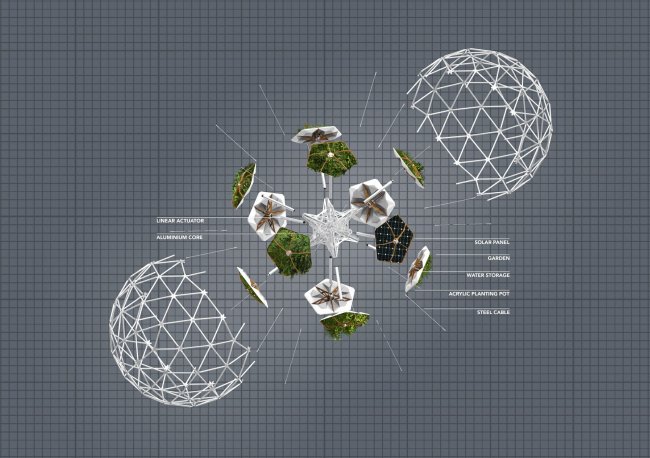 Разработанный студентами Уильям Виктор Камирелли (William Victor Camilleri) и Данило Сампайо (Danilo Sampaio) в рамках проекта Интерактивной архитектурной лаборатории «автономный сад» вдохновлен знаковой книгой Бакминстера Фуллера "Руководство по эксплуатации космического корабля Земля" и его геодезическими куполами. Мобильная экосистема использует сеть электродов для мониторинга физиологических реакций сада на окружающую среду, а затем, учитывая эти данные, приводит сферу в движение. Например, если растения в нижней части сферы не имеют прямого света, отдельные панели начинают смещаться, пока эти растения не будут в достаточной степени освещены. Роботизированное ядро может также переместить сферу на новое место, если сад требует тени или если уровень загрязнения воздуха окружающей среды превышает норму.