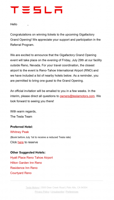 “Поздравляем по случаю получения выигрышных билетов к предстоящему Торжественному открытию Gigafactory! Мы ценим Вашу поддержку и участие в Реферральной программе.