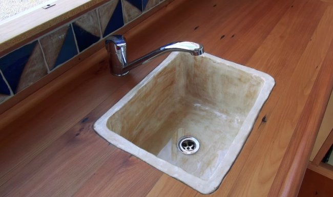 На рабочей поверхности в кухне установлен 130-литровый холодильник, раковина, варочная поверхность и духовой шкаф, а над ними вытяжка. Отведено место для душа и компостный туалета.