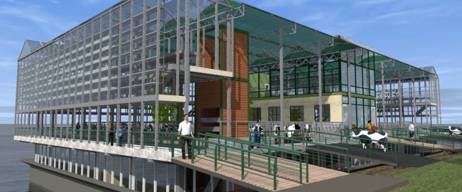 На понтоне площадью 1200 кв. м ферма должна производить молоко практически автономно, а для ее обслуживания потребуется всего двое работников. На верхнем этаже под стеклянной крышей будут размещаться 60 коров. Пол из искусственного газона и настоящие деревья должны создать для животных максимально приближенное к природному окружение.