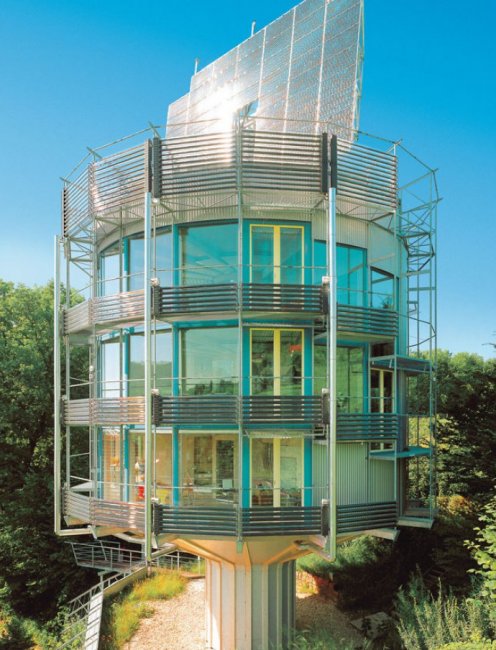 Архитектор Рольф Диш оборудовал солнечными батареями стадион футбольного клуба, затем построил "Гелиотроп". Это частный дом Диша. Он считается первым в мире зданием, которое производит больше энергии, чем потребляет. На крыше расположена солнечная батарея с 60-ю монокристаллическими кремниевыми модулями. Они поглощает солнечные лучи и преобразует их в электрический ток. С помощью компьютера владелец дома может следить, сколько энергии было произведено и потрачено. В зависимости от времени года "Гелиотроп" производит в четыре - шесть раз больше энергии, чем потребляет.