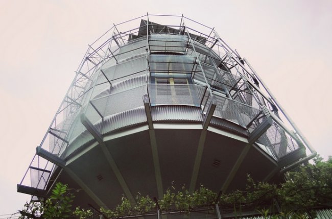 "Гелиотроп" стоит на деревянном «стволе» и, подобно подсолнечнику, вращается вслед за солнцем с тем чтобы обеспечить собственный «фотосинтез» и максимальный сбор тепловой энергии.
