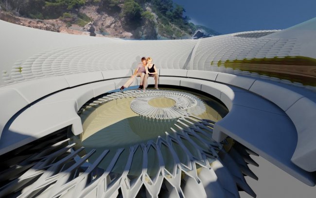 Бетонная «раковина» представляет собой полукруглое образование с интегрированными в него солнечными фотоэлементами, поставляющими электричество для жилых комнат. Внутренняя конструкция состоит гидравлических турбин, черпающих «чистую» энергию приливных волн. Поскольку приливы и отливы более предсказуемые явления, в отличии от энергии солнца или ветра, то найти наиболее благоприятное место для расположения дома с такой концепцией будет намного легче.