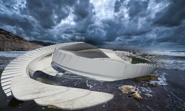 Морской экодом имеет под собой основание, которое уходит глубоко в песок или скальные породы. Сама конструкция здания состоит из двух «раковин» - внешней, отлитой из бетона и выполняющей роль своеобразного якоря, и внутренней – которая является подвижной частью и поднимается во время приливов над основанием.