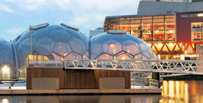 Floating Pavilion в Роттердаме - каждое из плавающих полушарий имеет высоту 12 метров, а общая площадь основания по размеру эквивалентна четырем теннисным кортам