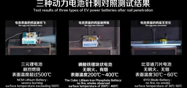 BYD привела несколько примеров тестов, в которых новинка показала себя лучше, чем предшествующие аналоги. Например, при пробитии гвоздем температура поверхности новой батареи нагревалась в пределах от 30 до 60 градусов Цельсия, в то время как обычная литий-ионный батарея достигала 500 градусов, а батарея LFP нагревалась до 200-400 градусов. Даже перезарядка в 260% не привела к возгоранию или взрыву, что также не наблюдалось при раздавливании, сгибании или нагреву батареи в печи до 300 градусов Цельсия.