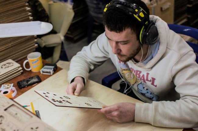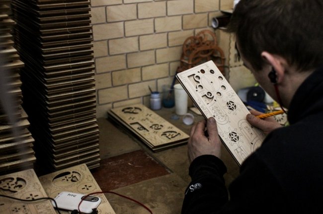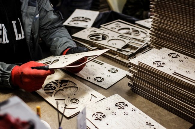 Много технологических проблем доставляет и материал паззлов — фанера. Изначально Денис собирался делать паззлы штамповкой из картона, пробовал создавать модели на чужом оборудовании. Но картон изнашивается. Пробовал ламели (деревянные планки), но оказалось, что примерно 40% из них — выбраковка, тестировали пенокартон, пенополистиролы, акрил. Остановились на фанере, детали вырезаются на листе лазерным резаком.