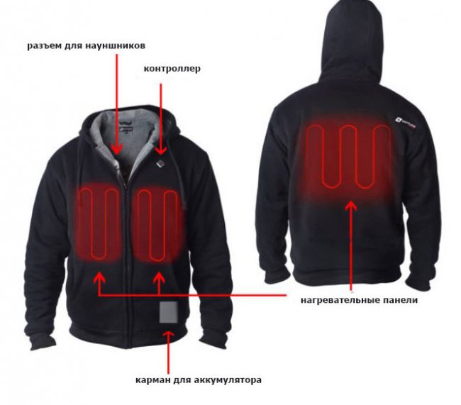 Гибкие нагревательные панели в толстовке расположены с учетом максимальной теплоотдачи. Они размещены спереди (две штуки на каждой половине груди) и сзади (одна большая на всю спину) и изолированы от тела специальным «дышащим» материалом, который свободно пропускает теплый воздух. Если же пользователь не нуждается в дополнительном обогреве, то USB-разъем можно использовать для подзарядки любого гаджета.
