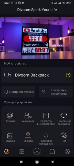 Пункты Голосовое сообщение и Чат предназначены для общения с другими владельцами гаджетов Divoom. Пункт Игра содержит набор небольших игр, в которые можно сыграть на экране рюкзака – ничего сложного на дисплее в 16х16 пикселей запустить не получится, но скоротать 10 минут в неторопливой очереди более чем реально.