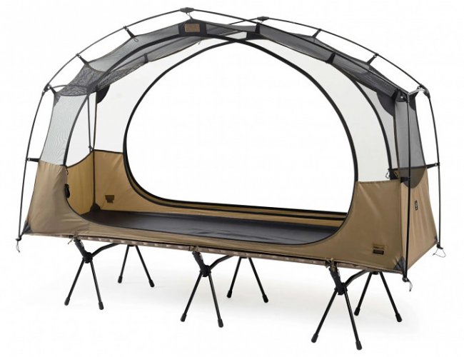 Серьезным преимуществом палаток Helinox перед конкурентами является прочность и надежность армейского уровня. Производитель предлагает не полные комплекты, а скорее дополнительную тканевую защиту для существующих кушеток-раскладушек Helinox. Самой простой и интересной в линейке стала мини-палатка, рассчитанная на 1 человека, имеющая широкие двери по бокам. В собранном виде палатка имеет размеры 57 х 20 х 20 см, а ее вес составляет всего 1,8 килограмма.