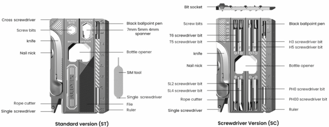 Standard (около 37 г) — без отсеков для бит, зато с отверткой Philips, набором гаечных ключей (4–7 мм), слотом под стандартную 1/4-дюймовую биту, инструментом для извлечения SIM-карты и напильником.