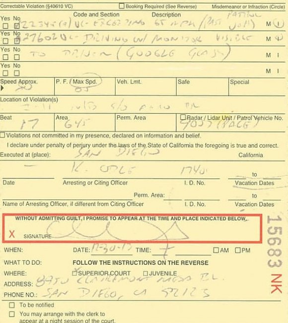 Как пишет американка на своей страничке в социальной сети Google+, остановивший ее патруль выписал штраф. В протоколе указывается, что она превысила максимально допустимую скорость и при вождении использовала очки Google Glass, которые отвлекали её от дороги. Однако сама Сесилия утверждает, что очки в тот момент были выключены.