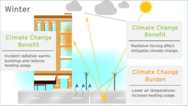 Твердые покрытия занимают около 40% площади городов. Дорожные материалы поглощают солнечное излучение, накапливая тепло. Оно выделяется в окружающую среду, нагревая ее. Если тротуары, дороги, и, например, крыши зданий сделать светлее, часть солнечного излучения, станет отражаться и уходить обратно в атмосферу.