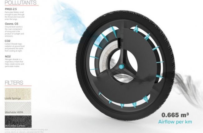 Кристен Таппинг, студентка Лондонского университета Саут Бэнк, получившая в прошлом году премию Design Innovation in Plastics, разработала велосипедное колесо, которое при вращении очищает воздух от загрязнений.