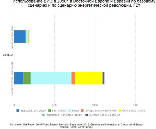 В Восточной Европе в странах с переходной экономикой объём возобновляемой энергии может достигнуть 190 ГВт (по базовому сценарию развития) до 1200 ГВт (по сценарию энергетической революции, как сообщает Гринпис).